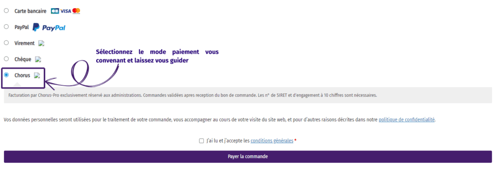Enfin, sélectionnez le mode de règlement Chorus. Merci de votre confiance !