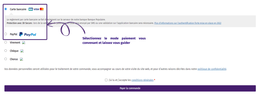 Enfin, sélectionnez le mode de règlement Carte bancaire ou Paypal. Merci de votre confiance !