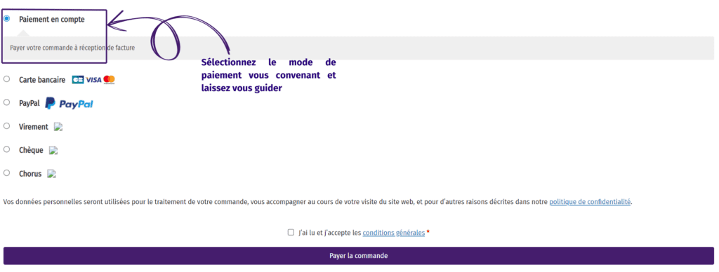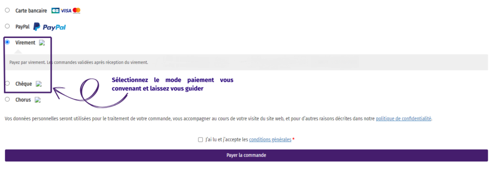 Enfin, sélectionnez le mode de règlement Chèque ou Virement. Merci de votre confiance !